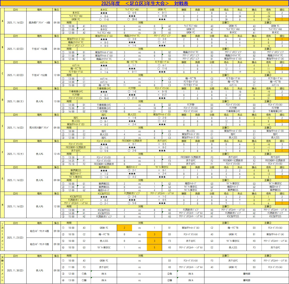 足立区3年生大会の途中結果をアップします。(11/23現在)
